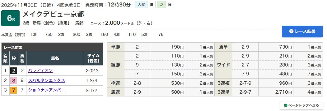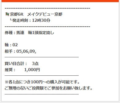 続く【11月30日(日)】公開された無料予想は東京から京都競馬に替り京都6R新馬戦、土日連続新馬戦とはかなりの自信なのか?新馬戦は競馬ファンでも情報薄なため見送るレース。
