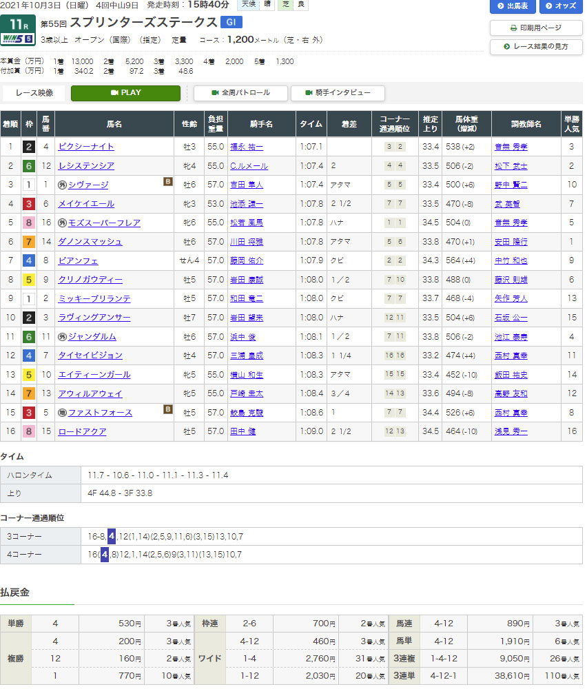 G1戦スプリンターズステークスですので結果を説明するまでもないと思いますが、