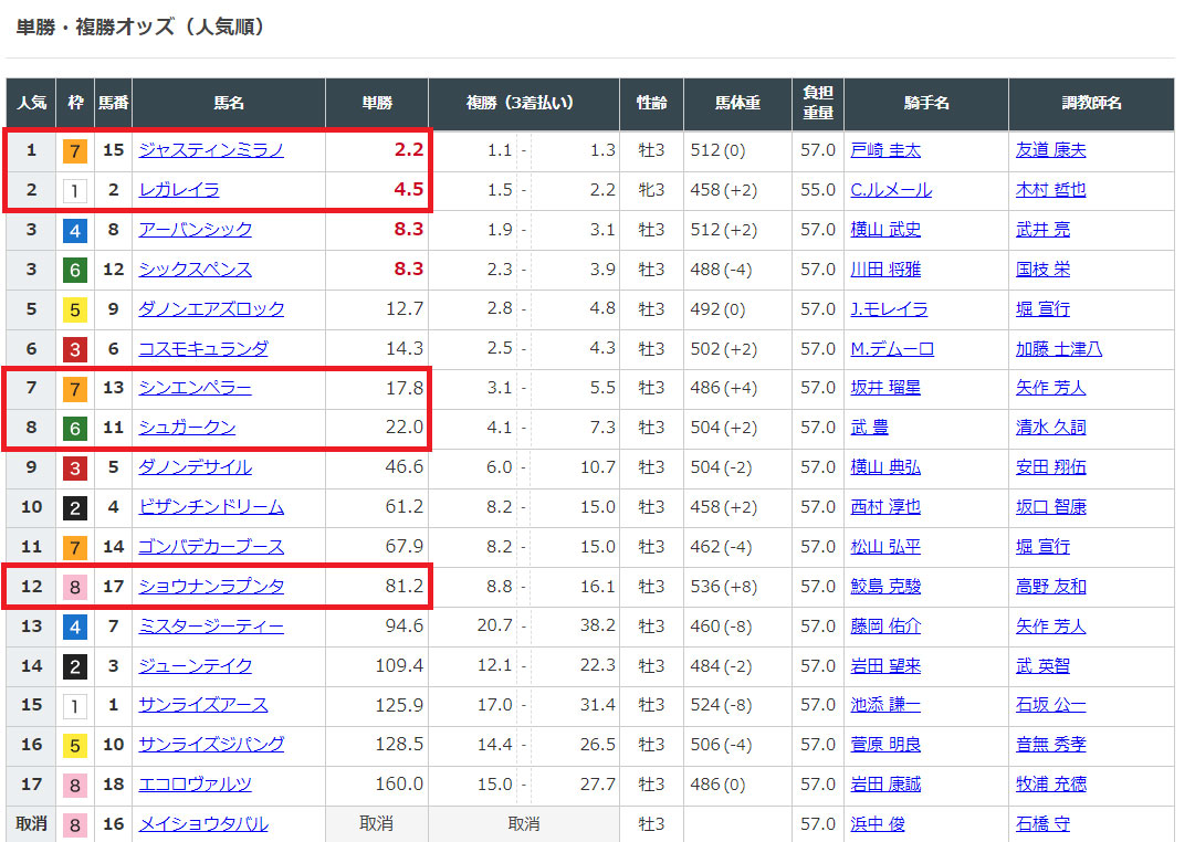 12番人気の⑰ショウナンラプンタが来たら美味しいオッズになるでしょうね。