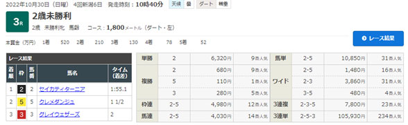 1番人気本命予想の⑤クレメダンジュと4番人気の③グレイウィザーズが追い上げてきましたが、9番人気の②セイカティターニアが見事に逃げ切り初勝利を飾りました。