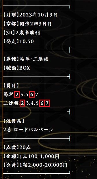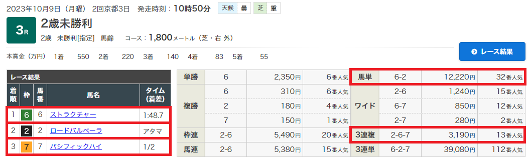 9日(月)京都3Rで無料情報馬単122.2倍&3連複31.9倍的中!