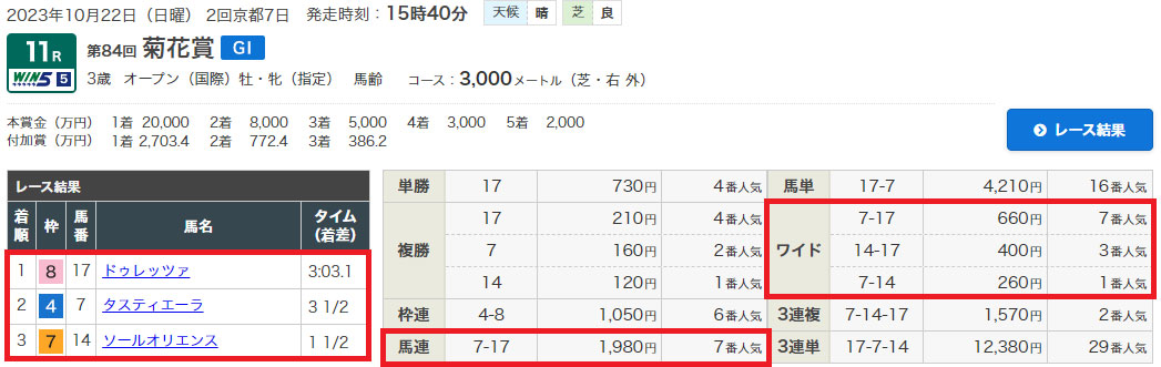 10/22(日)京都11Rで開催された菊花賞(G1)のワイド馬連5頭ボックスの予想。