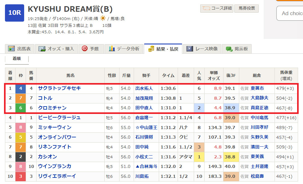 10/23(月)佐賀10R 3連単フォーメーション6点の予想。
