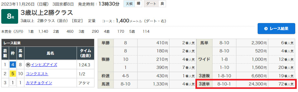 京都12R→294.3倍的中で35万3160円払い戻し!