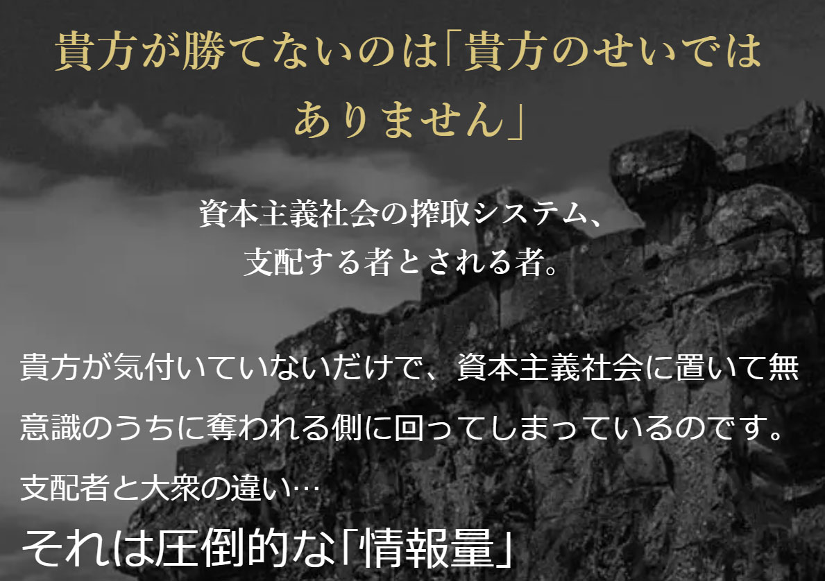 それを信じる「大衆」から「支配者」になれるチャンスがあるようですのでぜひ無料情報から実際に見ていきたいと思います!