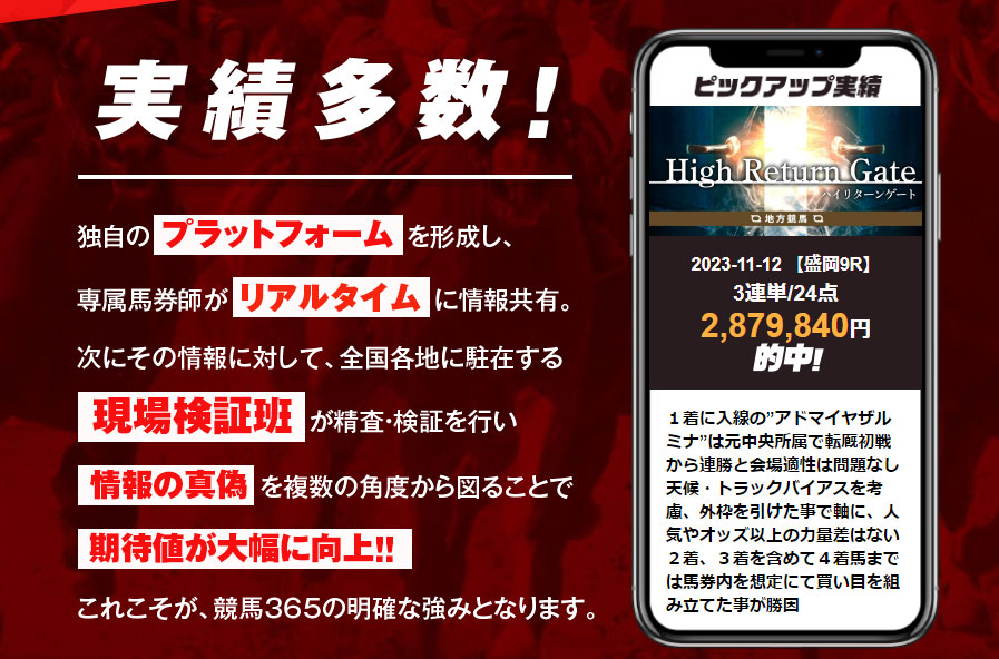 競馬365という名前の通り365日毎日現場捜査班が情報の精査と検証を行った信頼度と期待値の高い情報を提供してくれるのだとか!
