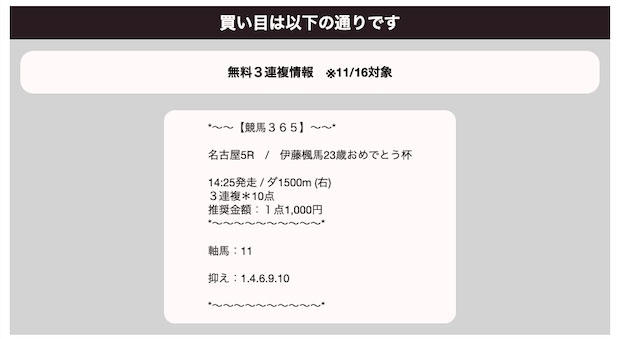 11月16日(木)名古屋5Rの三連複軸流し10点の予想