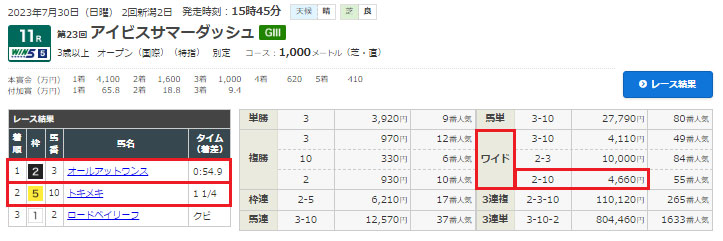 ただ馬券は千直で外枠有利と言われているアイビスSDであまり自信がないので本命から連下5頭までの「3・10・11・14・17」のワイドボックスで1点1000円の10,000円分の馬券を購入してみました。