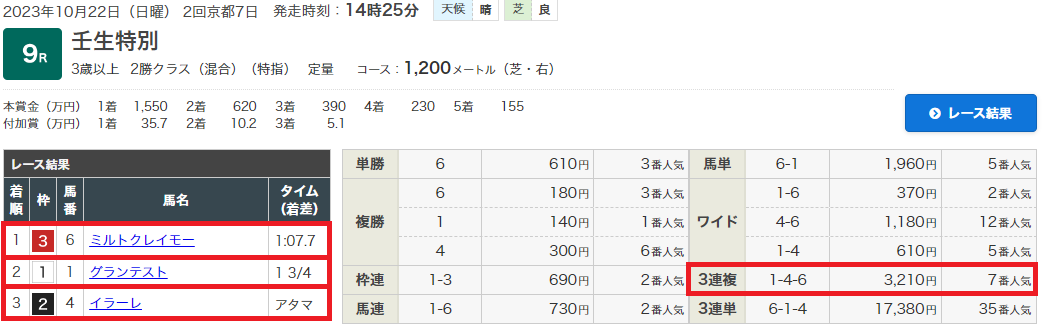 10月22日・京都9レース 壬生特別 3歳以上2勝クラス 芝1200m