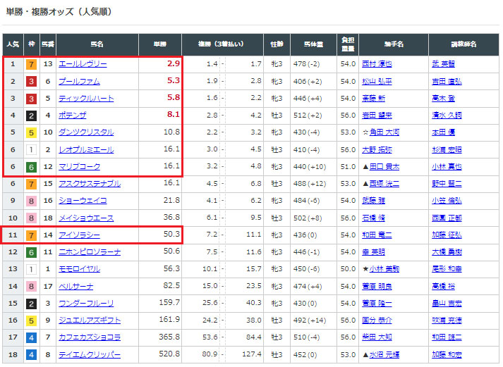 人気を見てみると上位人気7頭と11番人気の⑭アイソラシ―を選んでいました。