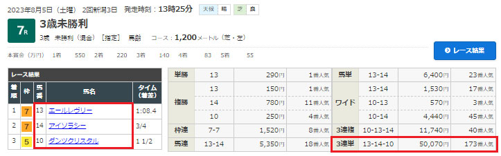 13-14-10で的中!!11番人気の⑭アイソラシーが2着に来て見事万馬券的中!