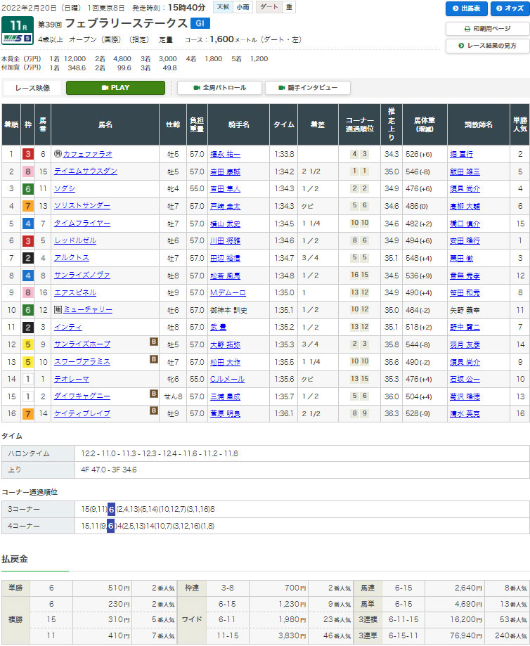 【検証レース:2/20 東京11R GⅠフェブラリーステークス】