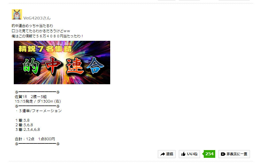 すでに競馬リポート内にこちらのサイトの的中の口コミも多くあるので、ご登録されている方もいらっしゃい思いますか?