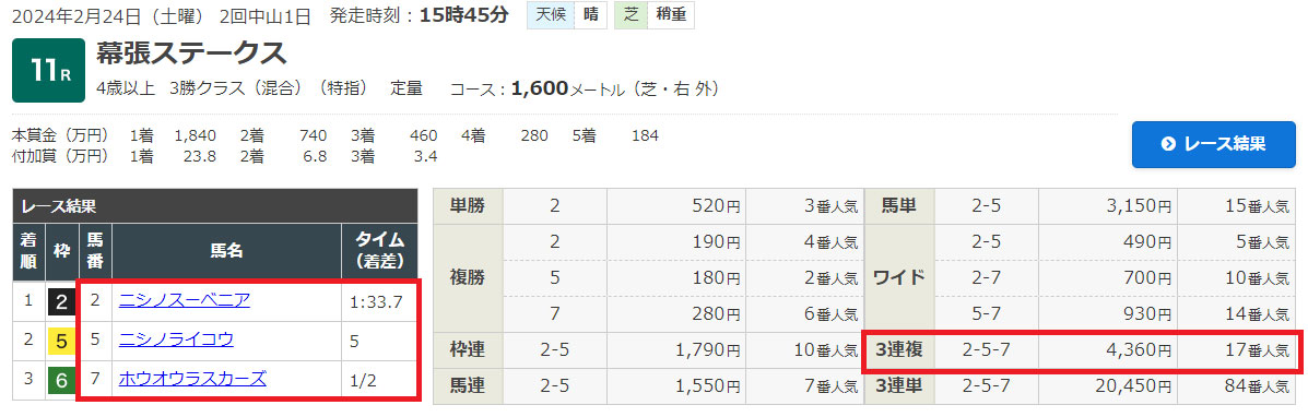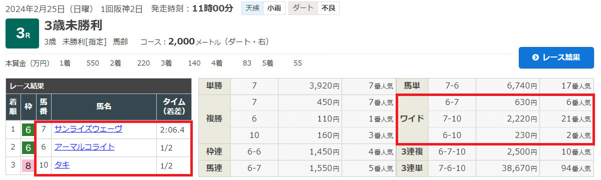 1番人気から流したワイドと3連複でそれぞれ残念な結果に終わってしまいました。