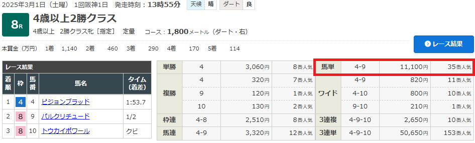 馬単とは思えない高配当的中で払戻しは11万1000円!
