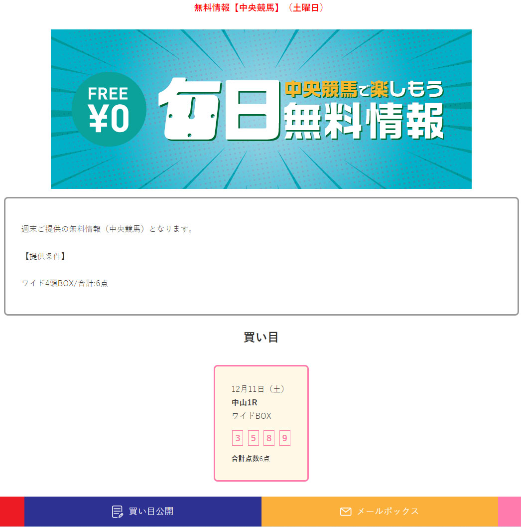 無料情報とはいえワイド4頭BOX6点買い目、オッズを見れば2桁人気馬を選択しているので払戻金額には期待が持てるが、そう簡単にワイド万馬券などうまれない事から本当に当てる気があるのか?と、疑問を頂く買い目。