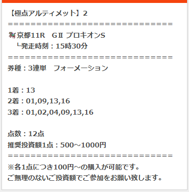 おそらく初回しか適応されない『スタートダッシュプラン』想定配当30~50万円、通常価格→7万円が9,800円。 安いし負けてもいいや感覚でやったらスタートダッシュどころか上半期分の収支をたった1レースで稼がせてもらいました。 フェアリーステークス15-4-1的中で、結果は公式乗ってるので引用はしませんが払い戻しは1点200円で賭けていたので175万8160円払い戻し、想定配当×3倍以上!